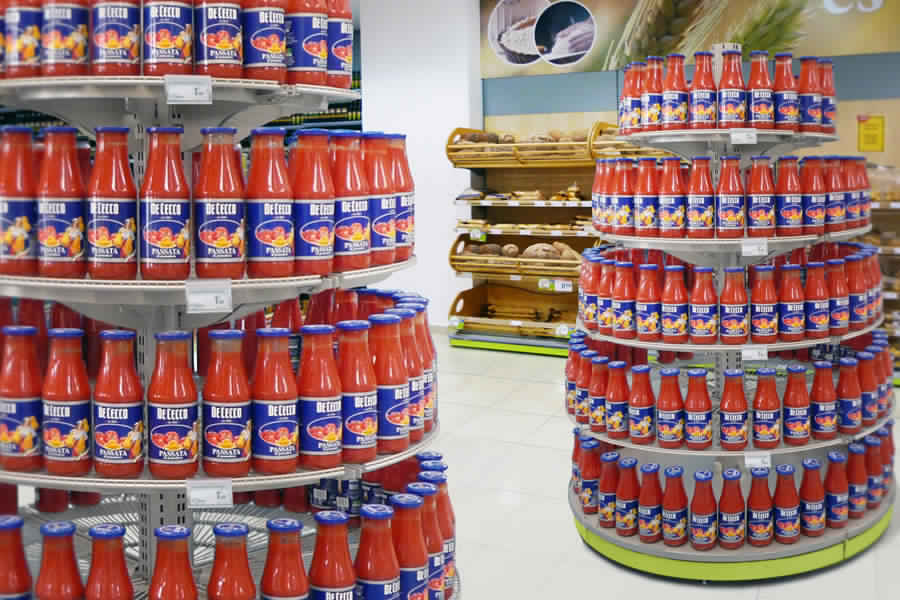 Les éléments en fil métallique valorisent avec élégance les agencements des points de vente, en permettant le passage de la lumière et en rendant moins évidente n’importe quelle rupture de stock, sur les petites et moyennes surfaces commerciales.